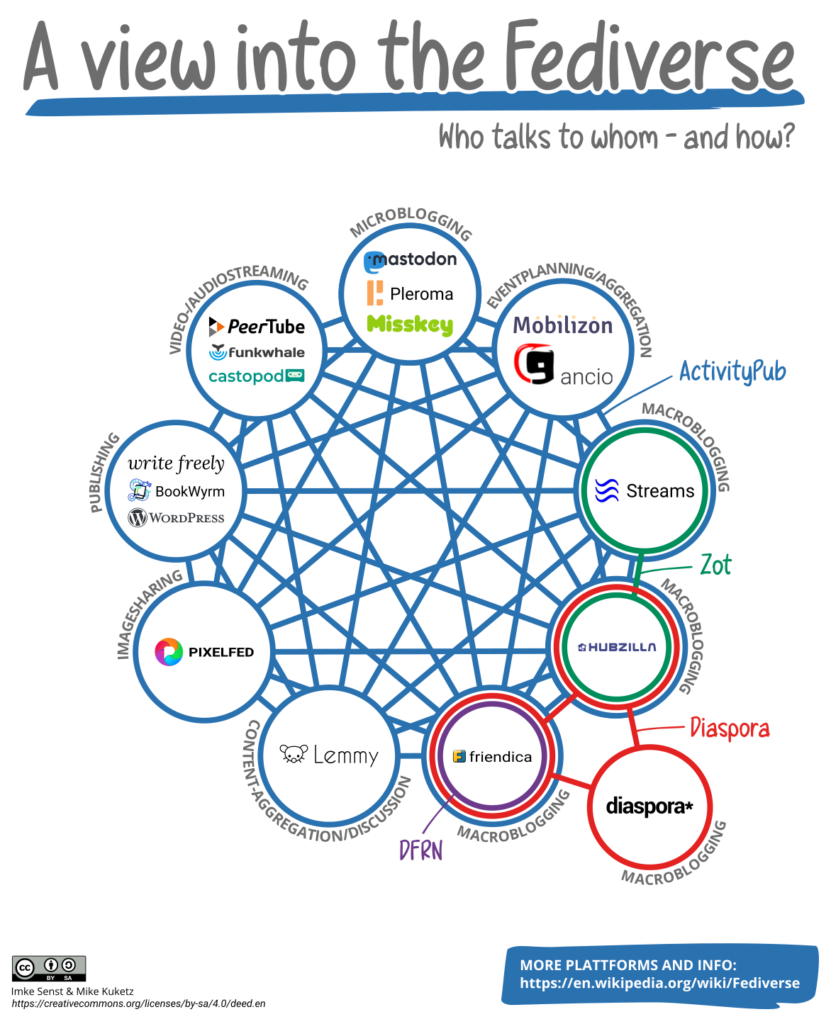 Das Fediverse ist ein Netzwerk aus vielen unabhängigen, aber miteinander verbundenen sozialen Plattformen (z.B. Mastodon, Pixelfed, etc.), die über offene Standards miteinander sprechen können.